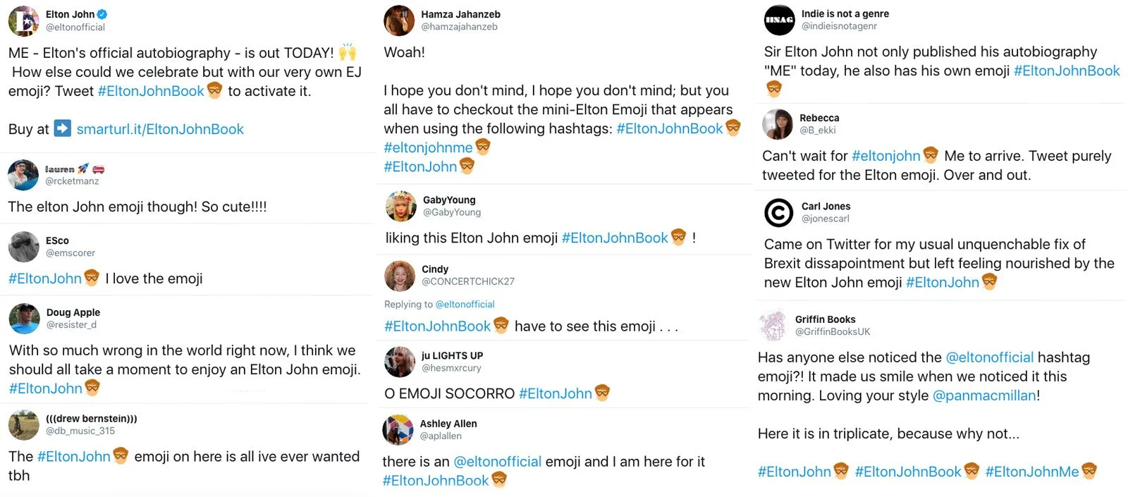 My debut emoji was for none other than Sir Elton John, commissioned by Pan Macmillan to celebrate the release of Elton’s autobiography (we’re on first name terms now obviously). ‘Tiny Elton’ as he’s fondly known, was attached to a selection of hashtags on Twitter as you can see below.