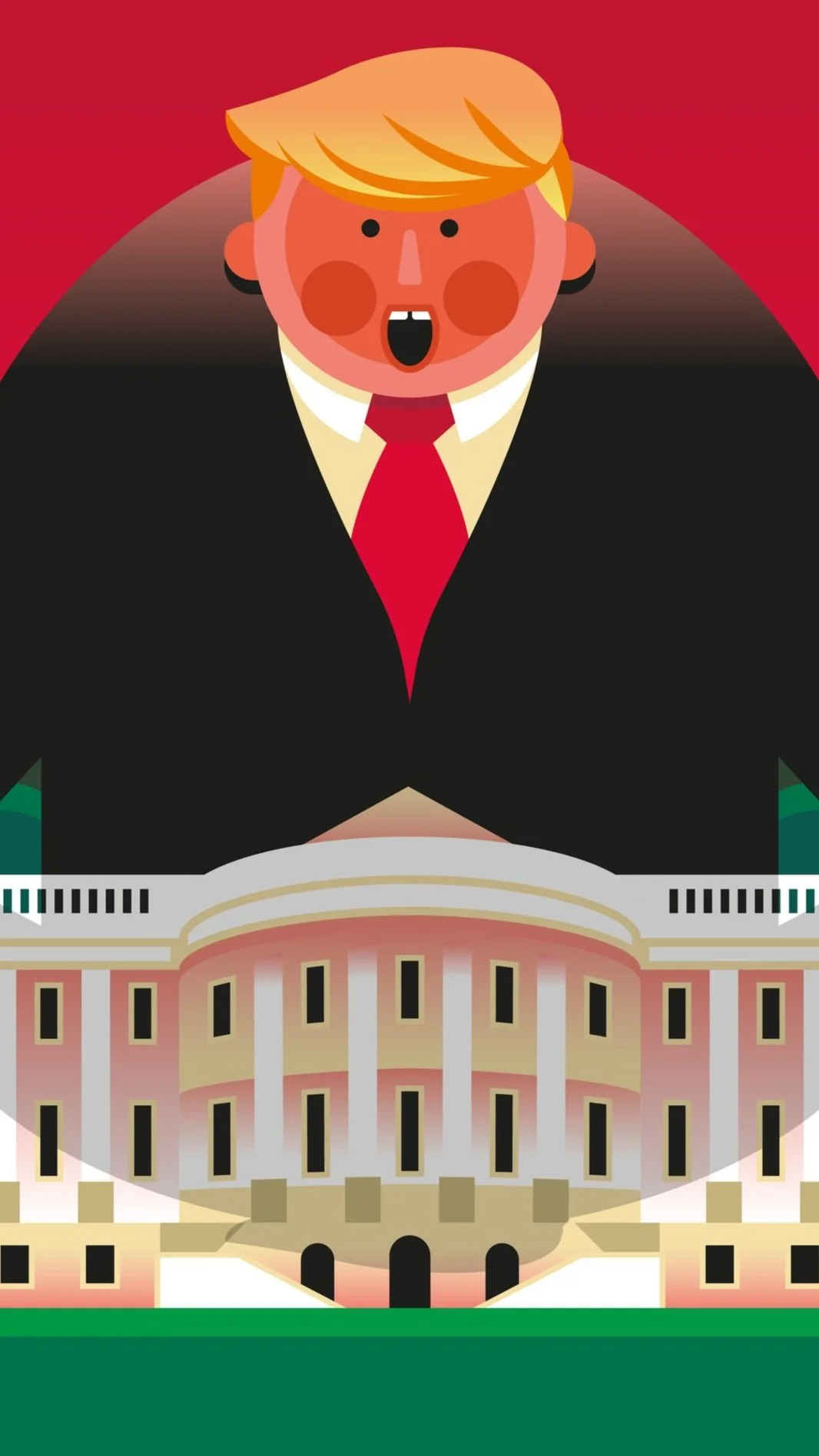 Illustration of a person with blonde hair, wearing a black suit, standing in front of a building with a red sky background, on the cover of a magazine titled 'The Political Landscape'